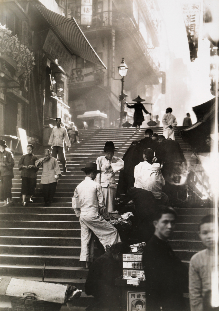 Vendors and pedestrians along a steep staircase in Hong Kong, November 1934.